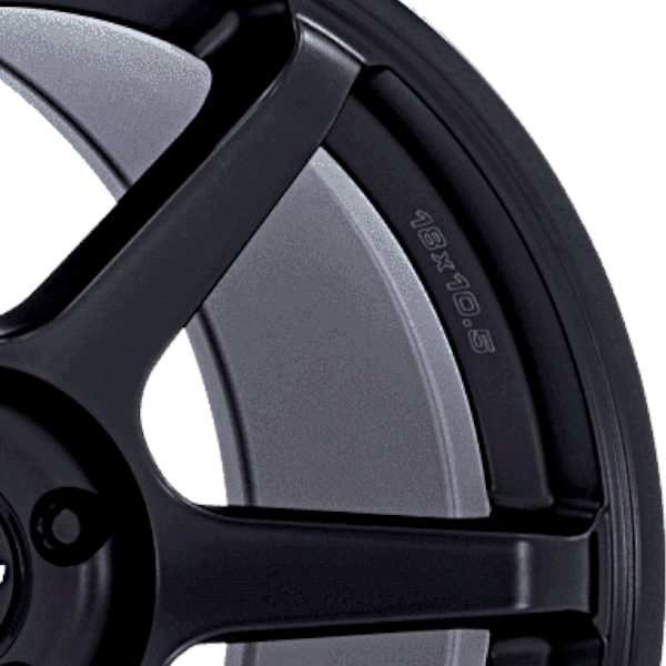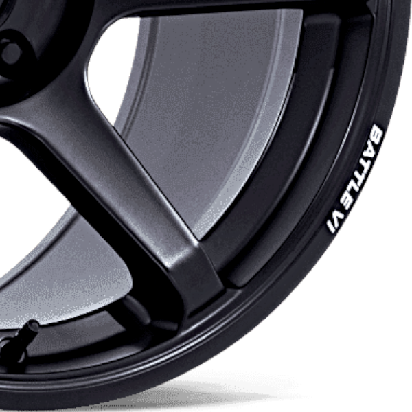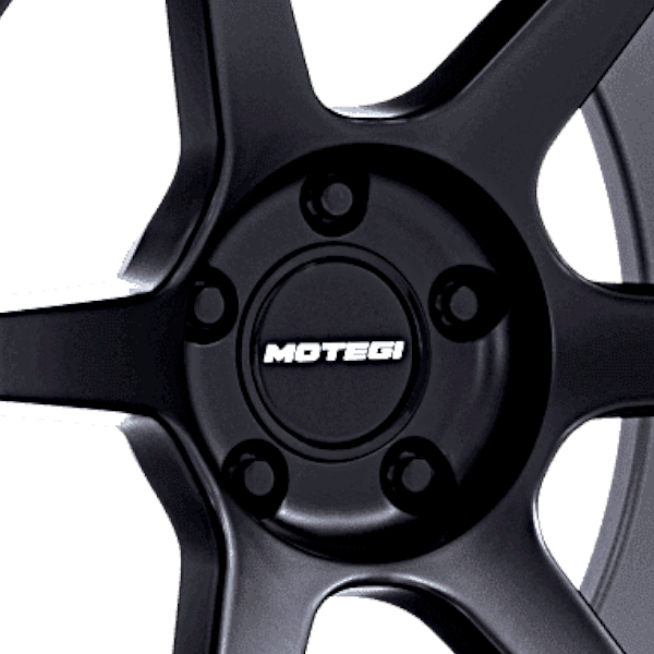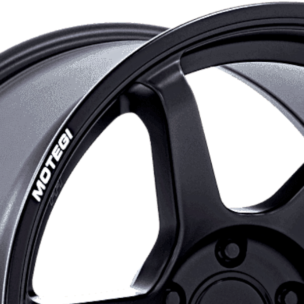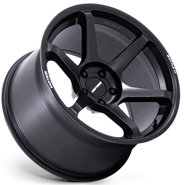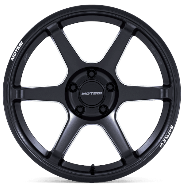 リムの「MOTEGI」「BATTLE Ⅵ」ロゴが印象的な6スポークブラックホイール。